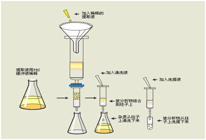 免疫親和柱利用抗原抗體特異性可逆結(jié)合的原理, 將抗體與凝膠共價(jià)結(jié)合,然后填充柱子。將樣品提取溶液過(guò)免疫親和柱,而非目標(biāo)化合物則沿柱流下,最后用洗脫緩沖液洗脫抗原,從而得到純化的抗原。其提純效率很高,適用于各類復(fù)雜樣品包括食品、飼料等多種基質(zhì)。整個(gè)純化過(guò)程30分鐘左右。